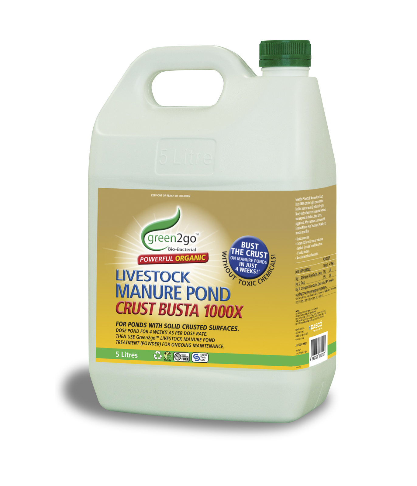 Green2goTM Livestock Manure Pond Crust Busta 1000X contains highly concentrated bacillius bacteria spores (2 trillion cfu/g) to liquefy hard surface crusts in aerated livestock manure ponds in abattoirs, dairy farms, piggeries etc.